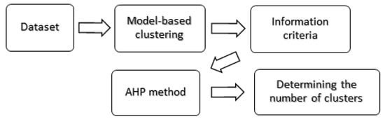 The model-based clustering is currently a very popular statistical-model. The information criteria for determining the number of clusters in the model-based clustering have commonly been used [42]. A number of criteria have been proposed to determine the number of clusters in a dataset. The current study has proposed an approach for determining the number of clusters by using the combination of the model-based clustering with the AHP. The AHP model has been created by using the information criteria AIC, AWE, BIC, CLC, and KIC. In Figure 2, the proposed approach has been described for determining the number of clusters of a dataset in the model-based clustering.