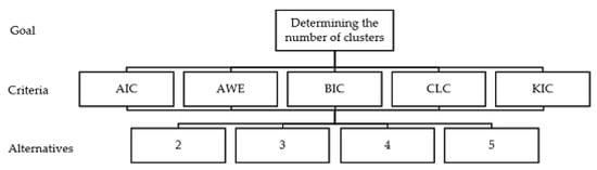 - Step 1. The hierarchical structure of the AHP has been created in Figure 3. In the figure, determination of the number of clusters is the goal, the AIC, AWE, BIC, CLC, KIC are the criteria, and 2, 3, 4, 5 are the alternatives.