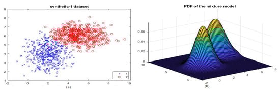 Pearson [5] first introduced the idea of the mixture distribution model by studying a mixture of two univariate normal distributions with different means and variances. Later on, many related works [6,7,8] have been carried out. Model-based clustering based on a mixture of distributions has commonly been used in the clustering of datasets. Some of those who used the mixture of multivariate normal distributions in the cluster analysis are Wolfe [9,10], Day [11], and Binder [12]. To estimate parameters in the mixture distribution model, the Expectation-Maximization (EM) algorithm suggested by Dempster et al. [13] has been widely used [14,15].