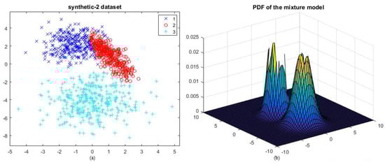 For the synthetic-2 dataset, we generate 1000 samples from a three-component bivariate normal mixture with the mixing proportions , the mean vectors , , , and the covariance matrices , , and . Figure 5 shows the scatter plot and the PDF of the mixture model of the synthetic-2 dataset.