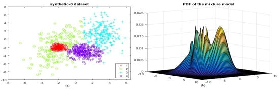 For the synthetic-3 dataset, we generate again 1000 samples from a four-component bivariate normal mixture with the mixing proportions , the mean vectors , , , and the covariance matrices , , , and . Figure 6 shows the scatter plot and the PDF of the mixture model of the synthetic-3 dataset.