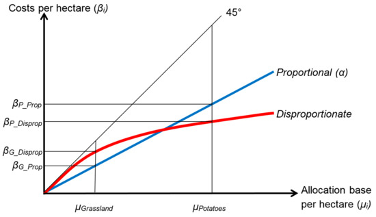 Figure 1 graphically illustrates a Proportional indirect-cost allocation and underscores the transformation of allocation bases. Specifically, the horizontal axis depicts the size of the allocation base per hectare. For two crops—Grassland (G) and Potatoes (P)—the cost allocation is depicted with Potatoes, representing a crop with a markedly higher allocation base. The resulting or allocated indirect costs per hectare are reported on the vertical axis. If we assume that the farm as a whole has lower costs than suggested by the farm-management literature (α < 1), the Proportional line, whose slope is equal to α, lies below the angle bisector (45°). According to Equation (4), the allocation bases μGrassland and μPotatoes are transformed to βG_Prop and βP_Prop, respectively.