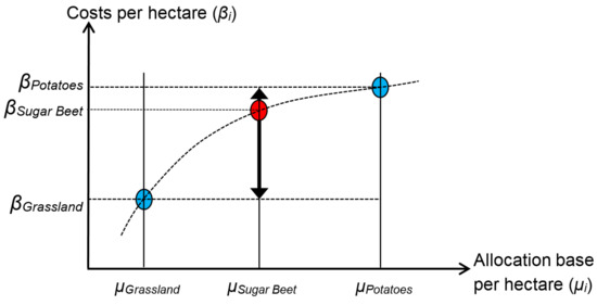 The literature provides an approach called indirect costing [2], which allocates indirect costs for all enterprises by means of allocation bases, also denoted as cost drivers (e.g., [3,4] or [5]). Drury [3] points out that volume-based allocation bases are frequently used, and distinguishes between physical measures (e.g., number of units) and measures indicating the ability to absorb indirect costs, such as market values of products. In the case of agriculture, the allocation bases used should reflect the marginal factor cost such as acreage, (working) hours, or number of (output) units [6]. For example, if available, Agri Benchmark prefers machine runtime-hours as an allocation base for machinery costs of crop enterprises [7].
