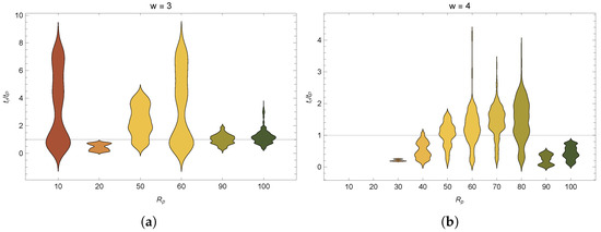 For , a rule is fully reversible, preserving information about its past state(s). For all other values the rule is irreversible, quantified on a sliding scale by how much information the rule destroys about past states. For the system is completely irreversible and looses maximal information (e.g., ECA rules 0 and 255 which map all states to the all-“0” or all-“1” state, respectively). We calculated R for all ECA rules and partitioned the rules by rounding to the nearest , thereby identifying 11 sets for each width. The relative size of each set is plotted in Figure 3 as a function of w.