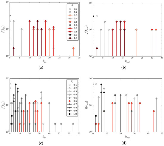 Frequency distribution of the in-degree (, (a,c,e)) and out-degree (, (b,d,f)) for state-transition diagrams for varying for widths (a,b), (c,d) and (e,f). State-transition diagrams with sampled trajectories exhibiting open-ended dynamics are shown in red, while those where no open-ended cases were confirmed are shown on a gray scale.