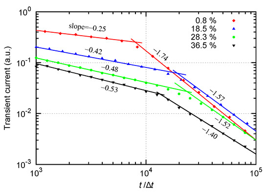 Transient currents for two values of electric field intensity for %. Lines are universal currents calculated according to Equation (16) with = 0.52 and 0.34.
