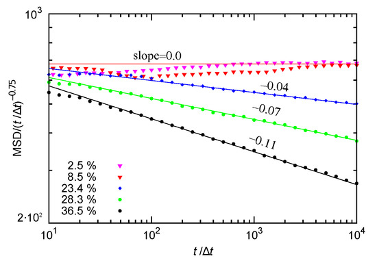 Mean square displacements for hopping diffusion (without electric field) in nanoparticle agglomerate with different porosity are presented in Figure 4. We can see that structural dispersion parameter (at diffusion) determined from relation is sufficiently closer to 1 than for directed percolation under applied electric bias.