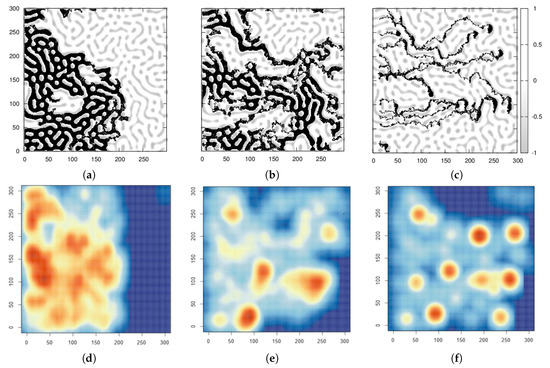 Trajectories (a–c) and two-dimensional histograms of visited sites (d–f) for 2D-hopping in spinodal pattern for different electric fields (a,d) V/cm; (b,e) V/cm; (c,f) V/cm.