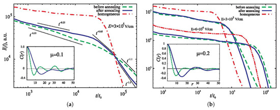 Figure 5 presents trajectories of hopping of 15 particles on the same spinodal pattern () for three values of the electric field. With increasing E, trajectories are drawn. At the same time, there are branches of carrier localization in topological traps not directly related to energy disorder. Transient current curves of hopping in spinodal patterns for two values of mass ratio and and Gaussian DoS () are presented in Figure 6. Two samples for each value of are obtained for different durations of spinodal decomposition (later realization is denoted as ‘after annealing’). Correlation functions of two patterns are also presented. The first minimum of these functions is a correlation length that determines the typical scale of p-n-domain separation. Annealing of samples increases the separation of p- and n-domains. Results are summarized in Table 3.