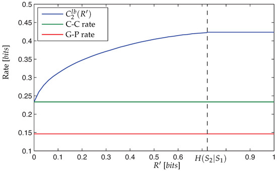 Please notice that in Equation (14), the rate of the side information, , can be written as . This is true since the Markov relation holds. Therefore, the only difference between the two upper bounds of Case 2, (13) and (14), is in the distribution over which we maximize. While for we restrict the maximization to distributions which maintain the Markov chain , for the second upper bound, , we restrict the maximization to distributions which maintain . We should note that we cannot state with certainty that one of the bounds is tighter than the other for all distributions and for all values of . Notwithstanding, one bound may be tighter than the other for all distributions.