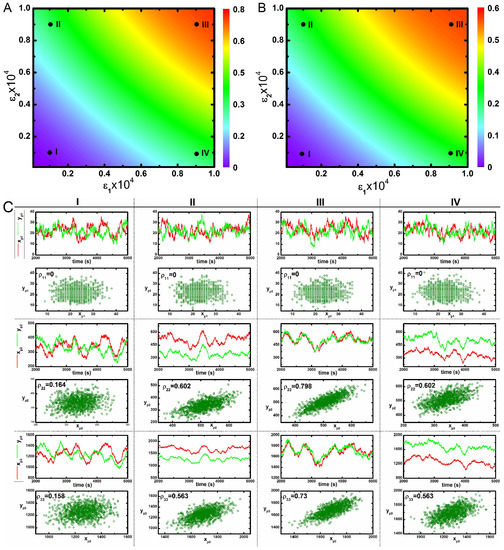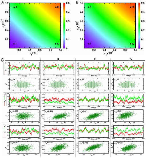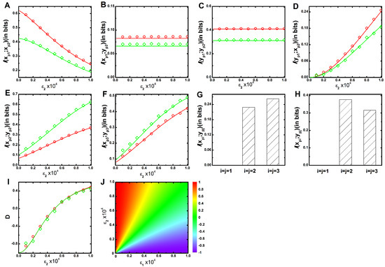 In the present work, all expressions of two variable mutual information are calculated using Equation (4). The analytical results are then validated by evaluating probability distribution functions (Equation (2)) using exact numerical simulation [43]. The two variable mutual information value is bounded within a scale . To quantify the association between two equivalent kinases, we have used Pearson’s correlation coefficient () [68]