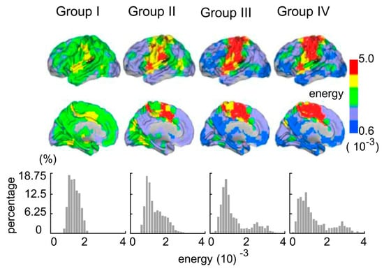 The topographic energy probability maps and energy probability histograms for the four groups.