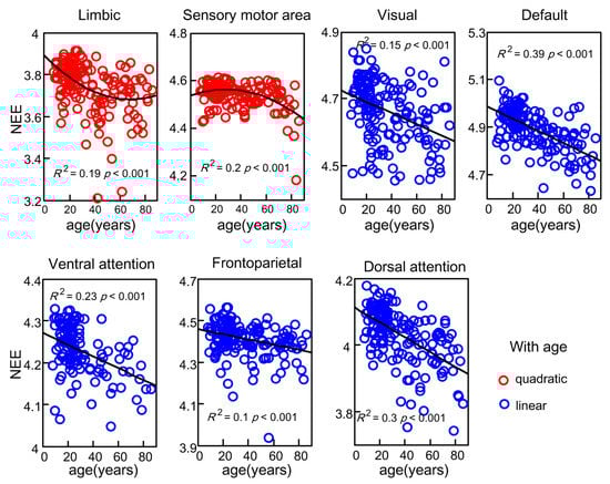 To assess how whole-brain NEEs in seven subsystems exhibited age-related changes, MLRs were fit to lifespan trajectories of the seven subsystems. The trajectories of the values of NEE in the seven subsystems showed linear or non-linear decreases with age (Figure 4). The overall trends were the same as the trend of the values of whole-brain NEE. Excluding the values of NEE of the limbic system and sensory motor area, the NEEs of the other five subsystems showed significant linear decreases with age. The age-related (t = −8.47, ) NEE trajectory within the dorsal attention network slipped the fastest (F (1, 167) = 71.82, ), and the age-related (t = −4.24, ) NEE trajectory within the frontoparietal network slipped slightly (F (1, 167) = 17.98, p = 3.69). In contrast, the NEE trajectory within the limbic system exhibited positive quadratic changes (F (2, 166) = 20.85, ) with age, and the NEE trajectory of the sensory motor area exhibited negative quadratic changes (F (2, 166) = 19.92, ) with age. Significant linear age effects (t = −3.69, ) and quadratic age effects (t = 2.45, p = 0.016) on limbic NEE were detected, and significant linear age effects (t = 2.45, p = 0.015) and quadratic age effects (t = −3.66, p = 3.44) on the sensory motor area NEE were also detected.