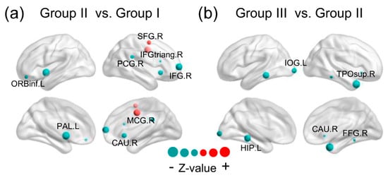 Through the Mann–Whitney rank-sum test on whole-brain EPs between Group II (youth period) and Group I (flourishing), we found that the significantly changed regions were mainly located in the right prefrontal cortex and basal ganglia, which are involved in emotion regulation and executive function in coordination with the action of the sensory system, implying that self-awareness and voluntary control performance significantly changed during neurodevelopment [69,70,71]. In addition, with the exception of the energy probabilities of the right median cingulate gyrus and right superior frontal gyrus which increased with age, other regions decreased with age. In contrast, a small set of significantly different regions was revealed between Group III (middle age) and Group II (youth period), which were less than that between Group II and Group I, and belonged to subcortical regions. These regions are mainly involved in long-term memory, implying that the memory of the human brain begins to decline with age during this period. Furthermore, we found that the brain regions where EP changes only comprised a small part of the whole brain and these changed brain regions were not synchronized. Between Groups III and IV, no brain region with significant EP changes was detected.