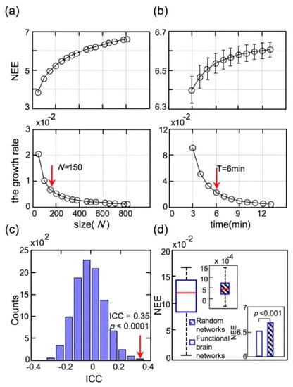 The ICC value for dataset II was 0.35, which indicated fair test–retest reliability. However, several limitations of ICC approaches have been described in [47]. In addition to the absolute values of ICC, we calculated the p-values of ICC using a permutation test. The p-value allowed a precise statistical analysis to evaluate the significance of the extracted ICC. The distribution of the ICC was displayed in Figure 6c through 10,000 repeated permutation tests. According to the absolute value and p-value (p < 0.0001) of the ICC, the metric NEE was considerably reliable in temporal or intra-individual conditions.
