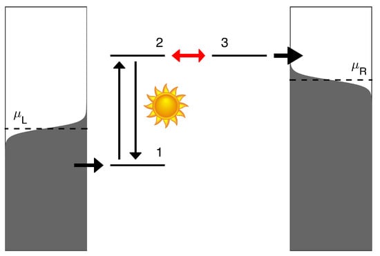 - Rutten, B.; Esposito, M.; Cleuren, B. Reaching Optimal Efficiencies Using Nanosized Photoelectric Devices. Phys. Rev. B 2009, 80, 235122. [Google Scholar] [CrossRef]