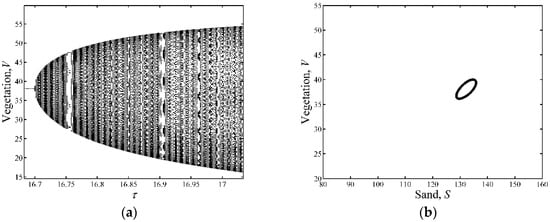 Bifurcation diagram and phase portraits of flip bifurcation. (a) Bifurcation diagram with parameters: k0 = 3.095 cm·d−1; h = 0.2 d−1; Vm = 100%; p = 0.045 cm−1·d−1; m = 0.2 cm·d−1; n = 0.07 d−1; V0 = 200%; C = 10%; D2 = 0.01 m2·d−1; (b–d) Phase portraits with parameter (b) τ = 16.7013 days; (c) τ = 16.755 days; (d) τ = 16.8667 days. Note that the figures are obtained by the software MATLAB 7.12.0 2011a (The MathWorks, Inc., Natick, MA, USA).