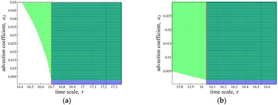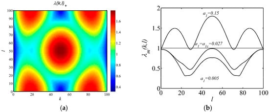where λmm(τ) represents the maximal value of absolute modulus of both eigenvalues in Equation (A41). When λmm(τ) > 1, Turing instability occurs; when λmm(τ) < 1, the discrete system stabilizes at the homogeneous states. Therefore, the threshold condition for the occurrence of Turing bifurcation requires λmm(τ) = 1.