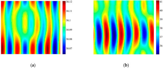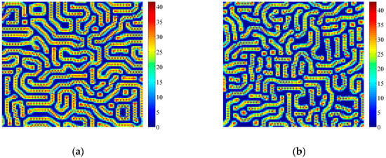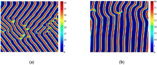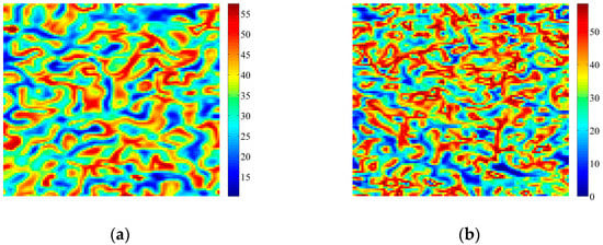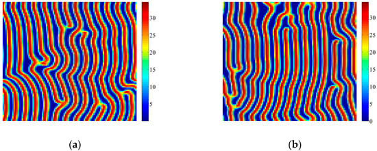 Firstly, vegetation patterns induced by only Neimark-Sacker bifurcation are shown in Figure 4. Given parameters k0 = 3.095 cm·d−1, h = 0.2 d−1, Vm = 100%, p = 0.045 cm−1·d−1, m = 0.2 cm·d−1, n = 0.07 d−1, V0 = 200%, C = 10%, D1 = 0.01 m2·d−1, D2 = 0.01 m2·d−1, a1 = 0.01 m·d−1, a2 = 0.01 m·d−1, d = 2 m, Neimark-Sacker bifurcation occurs when τ = τ0 = 16.6997 days. When τ > 16.6997 days, spatially heterogenous vegetation patterns can be induced by the Neimark-Sacker bifurcation. With the increase of τ, wavelength of vegetation patterns becomes smaller, and the whole pattern becomes more complex as shown in Figure 4b. The type of the spatially heterogeneous vegetation patterns is complex and irregular, and difficult to define. In this research, we define it as the Neimark-Sacker type patterns. The values of entropy in Figure 4a,b are calculated as 7.7066 and 7.7708, respectively.