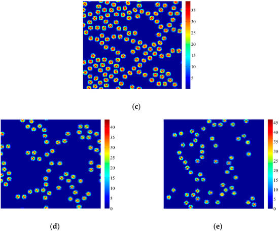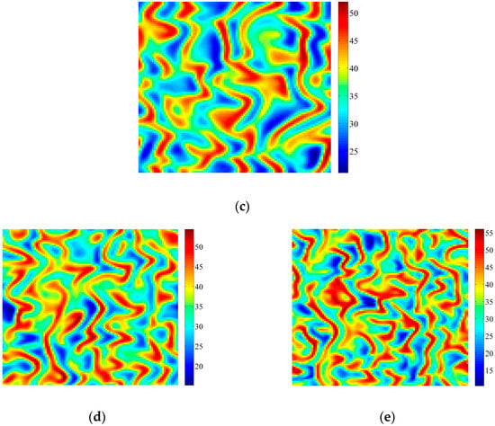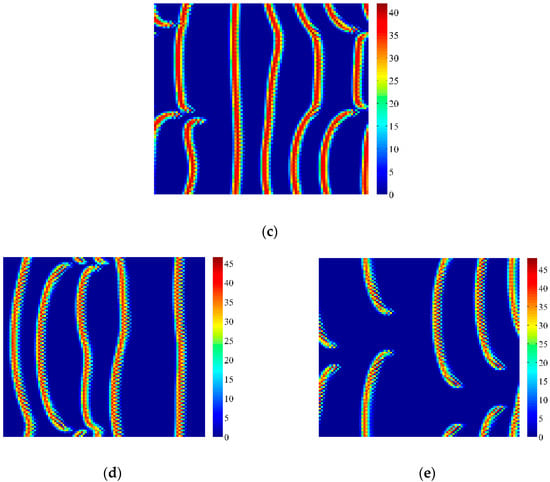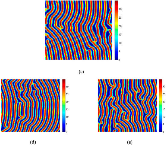 Figure 6 shows another series of vegetation patterns with the increase of time scale τ. When τ < τ0 = 16.0428 days, Turing bifurcation occurs and Figure 6a,b show that regular striped vegetation patterns with large amplitude can be formed. When τ > τ0, Neimark-Sacker bifurcation occurs. However the striped vegetation patterns seem unchanged as shown in Figure 6c–e. Obviously, these patterns are Turing type. The values of entropy in Figure 6a–e are calculated as 7.3101, 7.5809, 7.0303, 7.5018 and 7.3576, respectively. From Figure 5 and Figure 6, we can see that the coupled effects of Turing-Neimark-Sacker bifurcations can be different.