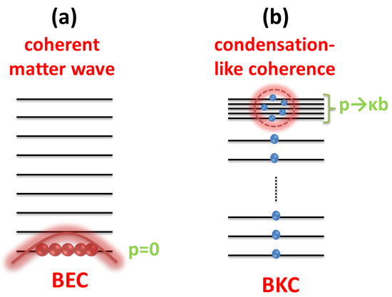 Figure 1. Schematic diagrams illustrating the basic differences and innate similarities between two kinds of condensations: (a) Bose–Einstein condensation (forms coherent matter wave) and (b) Born-Kothari condensation (forms condensation-like coherence). - On the other hand, as discussed in Section 2, the condensed phase for a FD gas occurs only at the highest energy state , characteristic of the reduced mass of the fermionic system. The reduced mass (rest mass) in case of BKC is analogous to for bosonic systems that dictates the existence of BEC below such critical temperatures.