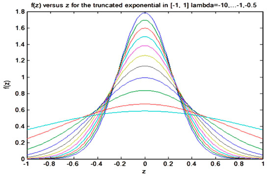 If we know new information on the parameters, for instance the mean value , then we can use the MRE principle to update the PDF with this information, as explained in Section 3. Then, if it is assumed that the distribution support does not change, it is obtained because Equation (14) the following result for the updated PDF