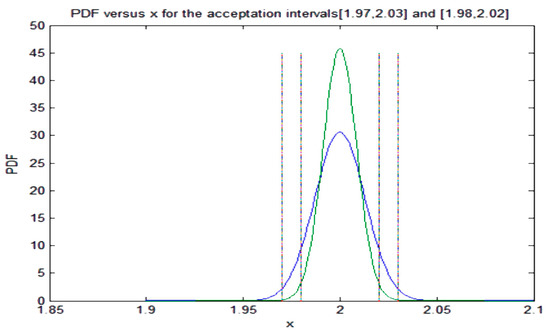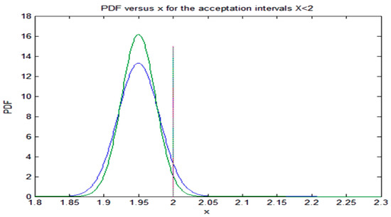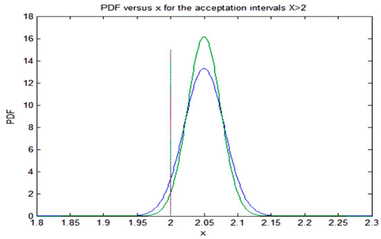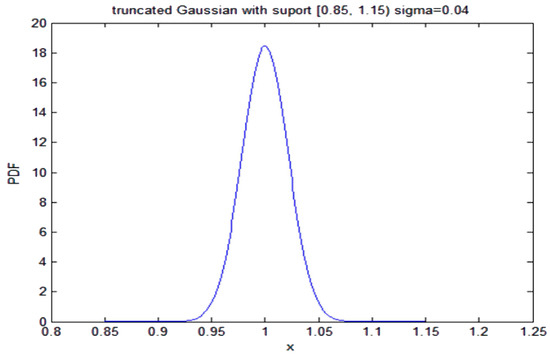 Next, we consider that the PDF given by (29) must satisfy Equation (21) and the set of Equation (22). In this case, we have assumed that the TS does not change the reference value, for instance, the reference pressures to open the safety and relief valve, but the limitation imposed by the TS in Equation (21) is more restrictive and could change the variance of the distribution. Then, Equation (22) because of Equation (29) yield the following set of conditions