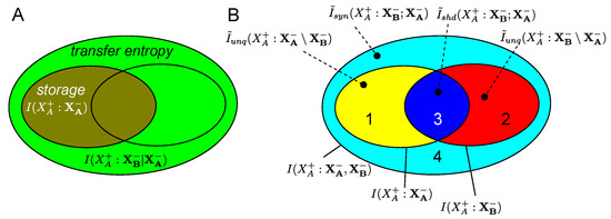 Here, is the active information storage [7], the predictive information from the past state of the variable to its next value. Then, is the transfer entropy [2], the predictive information from the past of the other source B to the next value of A, in the context of the past of A.