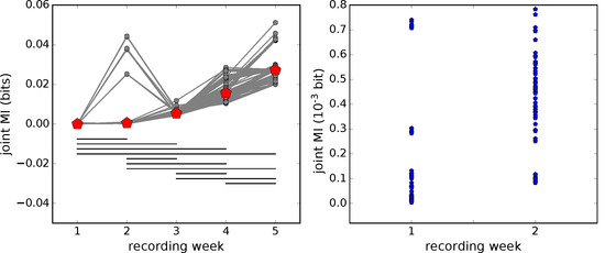 Left: development of the joint mutual information with network maturation. Grey symbols and lines—joint mutual information (MI) from individual pairs of spike time series, red symbols—median over all pairs. Horizontal black lines connect significantly different pairs of median values (, permutation test, Bonferroni corrected for multiple comparisons); Right: magnification of the joint mutual information estimates in the first two recording weeks. Note that the three large outliers from week 2 have been omitted from the plot. These tiny, but non-zero, values form the basis for the normalized non-zero PID terms presented in Figure 4—also leading to considerable variance there.