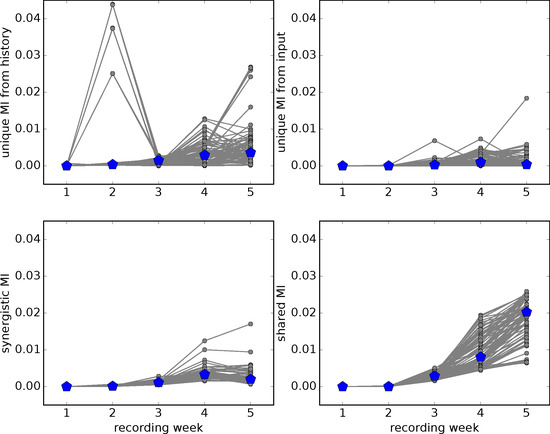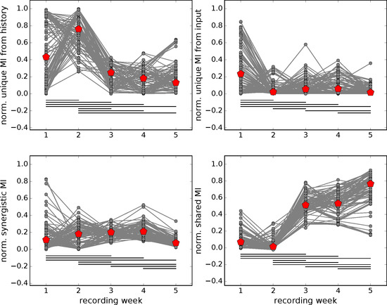 From preliminary investigations [36], we also expected the joint mutual information between both inputs and the output to rise. Given the caveat that we analyzed multi-unit activity here, instead of single units (i.e., single neurons) obtained by spike sorting, our results comply with these hypotheses: the initial two recording weeks were dominated by unique information from a spike time series’ own history, while, in intermediate recording weeks, synergistic and shared information were dominant, and shared information finally prevailed in the last two recordings (Figure 3 shows the joint mutual information, with the normalized PID contributions to this shown in Figure 4 and raw PID contributions in Figure 5).
