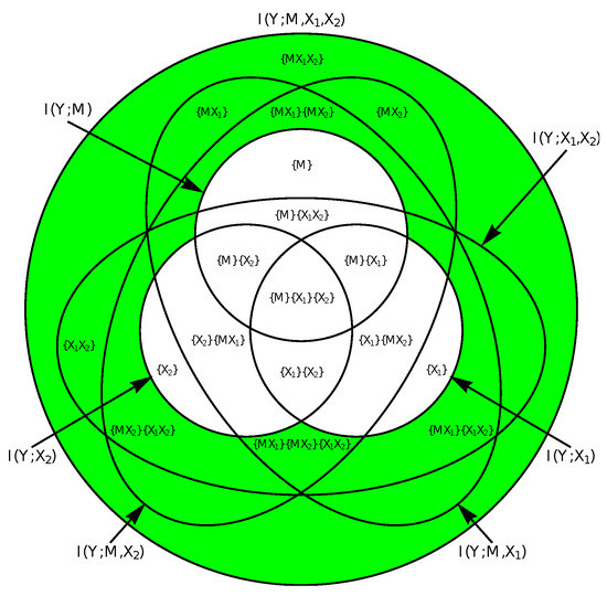 PID diagram for three input variables—two of them external inputs (, ), and one representing the past state of the receiving system (). The parts of the diagram highlighted in green would be considered information modification. These parts represent the information in the receiver that can only be explained by two or more input variables considered jointly.