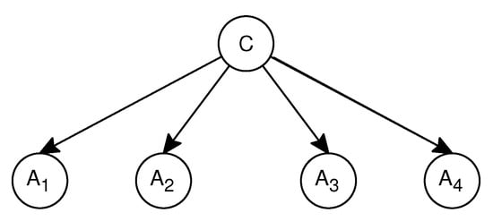 A Bayesian network (BN) is a graphical model that encodes probabilistic relationships among all variables, where nodes represent attributes, edges represent the relationships between the attributes, and directed arcs can be used to explicitly represent the joint probability distribution. Bayesian networks are often used for classification. Unfortunately, it has been proved that learning the optimal BN structure from an arbitrary BN search space of discrete variables is an non-deterministic polynomial-time hard (NP-hard) problem [].One of the most effective BN classifiers, in the sense that its predictive performance is competitive with state-of-the-art classifiers [], is the so-called naive Bayes (NB). NB is the simplest form of BN classifiers. It runs on labeled training instances and is driven by the conditional independence assumption that all attributes are fully independent of each other given the class. The NB classifier has the simple structure shown in Figure 1, where every attribute  (every leaf in the network) is independent from the rest of the attributes, given the state of the class variable C (the root in the network). However, it is obvious that the conditional independence assumption in NB is often violated in real-world applications, which will affect its performance with complex attribute dependencies [,].