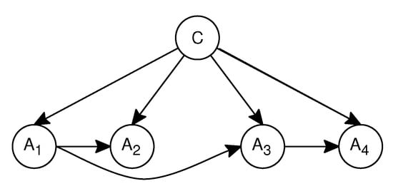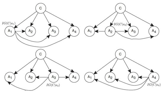 Friedman et al. [] proposed tree-augmented naive Bayesian (TAN). The TAN algorithm builds a maximum weighted spanning tree; the conditional mutual information between each pair of attributes is computed, in which the vertices are the attributes; they finally transform the resulting undirected tree to a directed one by choosing a root variable and setting the direction of all edges to be outward from it. In TAN, the class variable has no parents and each attribute can only depend on another attribute parent in addition to the class; each attribute can have one augmenting edge pointing to it. The example of TAN is shown in Figure 2.