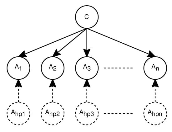 Jiang et al. [] proposed a structure extension-based algorithm (HNB), which is based on ODEs; each attribute in HNB has a hidden parent that is a mixture of the weighted influences from all other attributes. HNB uses conditional mutual information to estimate the weights directly from data, and establishes a novel model that can consider the influences of all the attributes; it avoids learning with intractable computational complexity. The structure of HNB is shown in Figure 3.