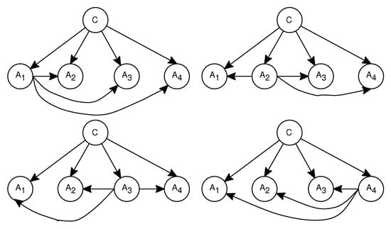 The approach of AODE [] is to select a limited class of ODE and to aggregate the predictions of all qualified classifiers where there is a single attribute that is the parent of all other attributes. In order to avoid including models for which the base probability estimates are inaccurate, the AODE approach excludes models where the training data contain fewer than 30 examples of the value for  of the parent attribute . An example of the aggregate of AODE is shown in Figure 4.