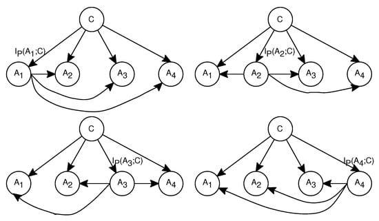 However, all ODEs in AODE have the same weights and are treated equally. WAODE [] was proposed to assign different weights to different ODEs. In WAODE, a special ODE is built for each attribute. Namely, each attribute is set as the root attribute once and each special ODE is assigned a different weight. An example of the aggregate of WAODE is shown in Figure 5.