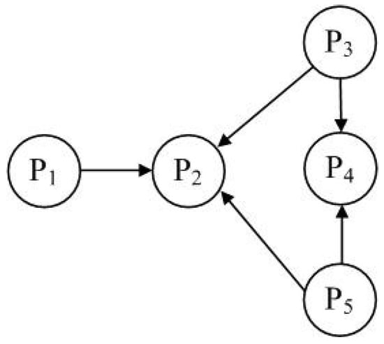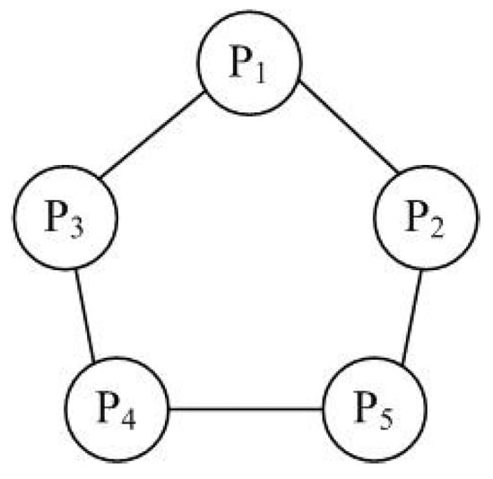 Consider an NEG consisting of five players, in which the set of players is denoted by and the network graph of the game is shown in Figure 2. The basic game of this NEG is the Boxed Pigs Game [], whose payoff matrix is given in Table 3, where “Press” and “Wait” are denoted by “1” and “2”, respectively. Hence, all the players have the same strategy set . In this NEG, is assumed to be a control, while is assumed to be an attacker. We suppose that and denote small pigs, while and big pigs. Denote the strategies of , , , and at time t by , , , and , respectively.