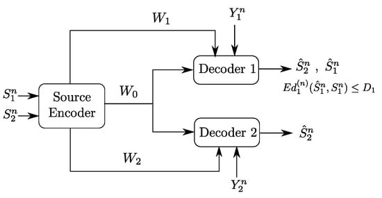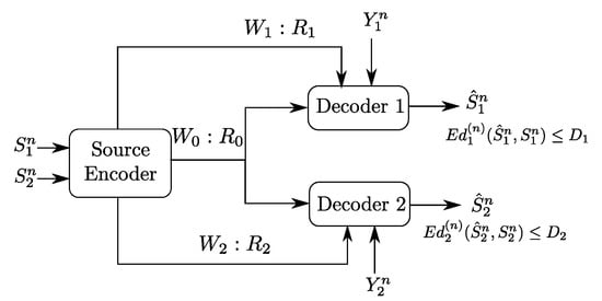 The Gray–Wyner source coding problem was originally formulated, and solved, by Gray and Wyner in []. In their original setting, a pair of arbitrarily correlated memoryless sources is to be encoded and transmitted to two receivers that are connected to the encoder each through a common error-free rate-limited link as well as a private error-free rate-limited link. Because the channels are rate-limited, the encoder produces a compressed bit string of rate that it transmits over the common link, and two compressed bit strings, of rate and of rate , that transmits over the private links each to their respective receiver. The first receiver uses the bit strings and to reproduce an estimate of the source component to within some prescribed distortion level , for some distortion measure . Similarly, the second receiver uses the bit strings and to reproduce an estimate of the source component to within some prescribed distortion level , for some different distortion measure . In [], Gray and Wyner characterized the optimal achievable rate triples and distortion pairs .