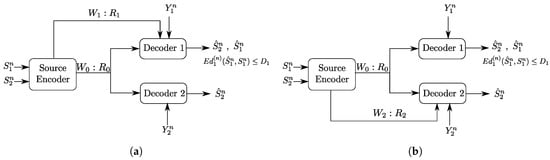 The model of Figure 3b has the individual rate-limited link connected to the receiver that is required to reproduce only the source component . We will refer to this model as a “Heegard–Berger problem with scalable coding”, reusing a term that was introduced in [] for a similar scenario, and in reference to that user 1 may have such a “good quality” side information that only a minimal amount of information from the encoder suffices, thus, so as not to constrain the communication by user 2 with the lower quality side information, an additional rate limited link is added to balance the decoding capabilities of both users.