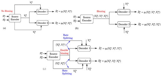 Comparison of coding schemes for the Gray–Wyner network with side information, Gray–Wyner network and the Heegard–Berger problem: (a) coding scheme for the Gray–Wyner network; (b) coding scheme for the Heegard–Berger problem; and (c) coding scheme for the Gray–Wyner network with side information.