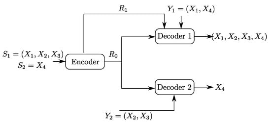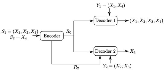 Let , , and be four independent random variables. Let the sources be and . Now, consider the Heegard–Berger model with successive refinement shown in Figure 5. The first user, which gets both the common and individual links, observes the side information and wants to reproduce the pair losslessly. The second user gets only the common link, has side information and wants to reproduce only the component , losslessly.