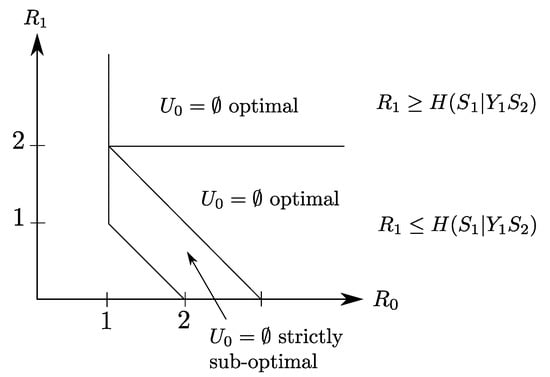 The optimal rate region of Claim 2 is depicted in Figure 8, as the region delimited by the lines and . Note that for this example, the source component , which is the only source component that is required by Receiver 2, needs to be transmitted entirely on the common link to also be recovered losslessly by Receiver 1. For this reason, the refinement link is not-constrained and appears to be useless for this example.