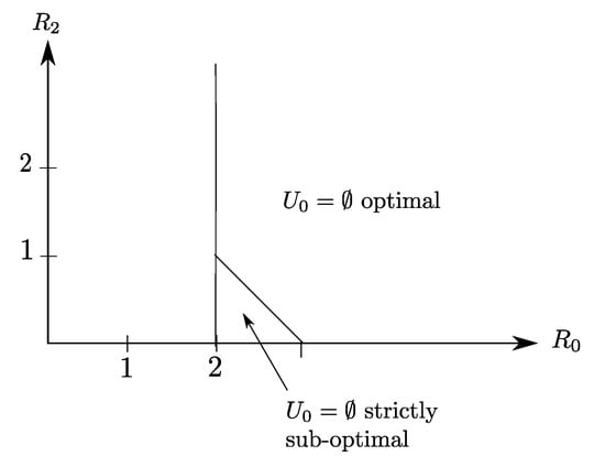 In the special case in which , the Gray–Wyner model with side information and degraded reconstruction sets of Figure 2 reduces to a Heegard–Berger problem with arbitrary side information sequences and degraded reconstruction sets, a model that was studied, and solved, recently in the authors’ own recent work []. Theorem 1 can then be seen as a generalization of (Theorem 1, []) to the case in which the encoder is connected to the receivers also through error-free rate-limited private links of capacity and respectively. The most important insight in the Heegard–Berger problem with degraded reconstruction sets is the role that the common description should play in such a setting. Authors show in (Theorem 1, []) that the optimal choice of this description is to contain, intuitively, the common source intended to both users, and, maybe less intuitive, an additional description , i.e., , which is used to piggyback part of the source in the common codeword though not required by both receivers, in order to balance the asymmetry of the side information sequences. In Section 4 and Section 5 we show that the utility of this description will depend on both the side information sequences and the rates of the private links.