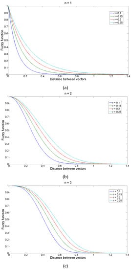 Figure 1 shows the changes in the shape of the fuzzy exponential function changes with n and r. It has been recommended to use small integer values of n [] and set the tolerance width as r times the standard deviation (SD) of the original data sequence []; the latter would give FuzzyEn scale invariance [].