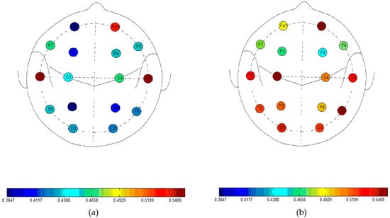Figure 2 summarises the average FuzzyEn values for n = 1, m = 2, and r = 0.25 times the SD of the EEG time series, the combination of input parameters that highlights the biggest differences between both groups for all possible input parameter combinations. The decrease in entropy in AD patients is particularly evident for electrodes that are placed over the parietal, occipital, and temporal regions.