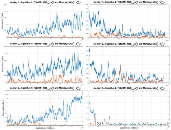 Figure 1 shows the mutual information between the joint variable and a monkeys next act measured by the mutual information and the amount of information the monkey uses from its last choice, i.e., its active memory: . It can be seen that for Algorithm 1 all three monkeys gradually increase the total amount of information from the previous choice that is being used to make their next choice. In contrast, for Algorithm 2 the amount off information decreases over time as the monkeys use less and less of past information to make their next choice. The amount of active memory of past choices the monkeys are using makes up very little of the total information.