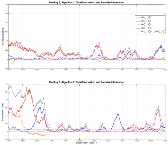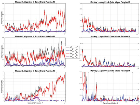 The largest pairwise contribution to the total information , shown in black in Figure 2, comes from the monkeys following the reward during Algorithm 1, i.e., shown in red in Figure 2, and this is also true in the first few thousand experiments of Algorithm 2. Neither the computer’s previous choices nor the monkeys’ previous choices have a consistently strong pairwise relationship with . Note that by the time the experiments finish for Algorithm 1, monkey 3 uses almost one bit of information from its most recent past reward in order to make their next choice.