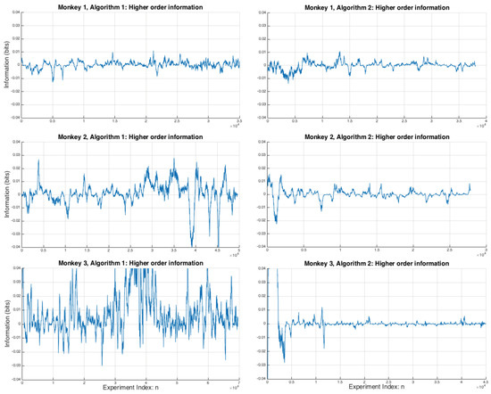 In Figure 4 is plotted for all monkeys and both algorithms. This is a measure of the deviation from pairwise independence and acts as a lower bound on the amount of information in the higher order interactions between the variables, see [27,28] for a detailed discussion on the partial information decomposition of the XOR gate, which is formally equivalent to the logic of the matching pennies game [5]. It can be seen hat Monkey 3 (Algorithm 1) has a greater degree of divergence from pairwise independence in its strategies, suggesting that there may be higher order, i.e., more complex, interactions between the variables that are not being picked up by the pairwise information measures. However Monkey 3 also has the lowest when playing against Algorithm 2 (after an initial transient of the first few thousand games).