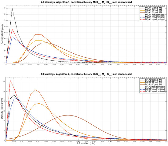 The densities were modelled using a log-normal distribution from the suite of statistical analysis functions in Matlab (R2014b, MathWorks, Natick, Massachusetts, USA). There are distinct and very consistent differences between the randomised (see the caption to Figure 3 for the method) and non-randomised estimates of the amount of information that the monkeys are able to use from two steps into the past interactions. In particular when playing against Algorithm 2, Monkey 3 appears to extract more information than the other monkeys from earlier games. From this result it can be seen that the Markov property that was assumed for the theoretical results in the previous article [5] is violated, but the degree of this violation is relatively mild.