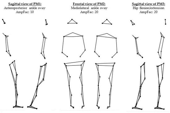 Visualization of the first three principal movement components (PM1–PM3) through the two positions with maximum deviation from the mean posture. For the visualization, the movement amplitude was further amplified with amplification factors (AmpFac).